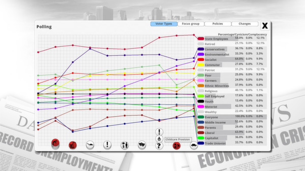 "Democracy 3" — это симулятор политического управления, в котором игрок принимает на себя роль лидера государства, принимая важные решения, влияющие на судьбу общества. Это не просто игра, а настоящая лаборатория для тестирования политических стратегий и решений. Здесь сталкиваются идеалы и реальность, и каждый выбор может привести к непредсказуемым последствиям.