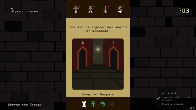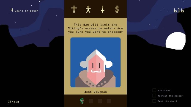 Каждый выбор, будь то заключение мира, налоговая политика или отношения с церковью, требует взвешенности и стратегии. Картинки и интерфейс выполнены в стильном минималистичном дизайне, который на первый взгляд может показаться простым, но на деле скрывает множество нюансов. Игра дарит чувство динамики, что делает каждую партию увлекательной и непредсказуемой.
