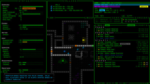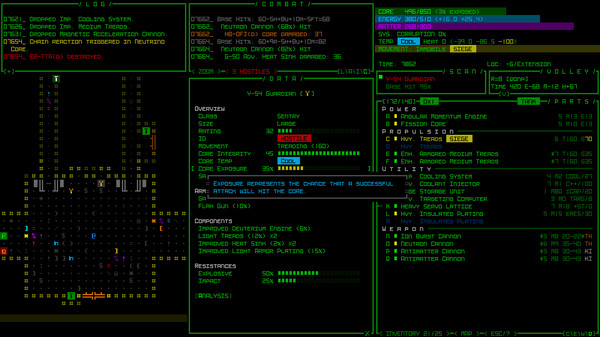 "Cogmind" — это roguelike, созданный в уникальном 2D-стиле, где игроки управляют разумными механическими существами, исследующими подземелья и сражающимися с врагами, собирая различные модули и улучшая свою боевую мощь.