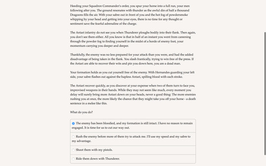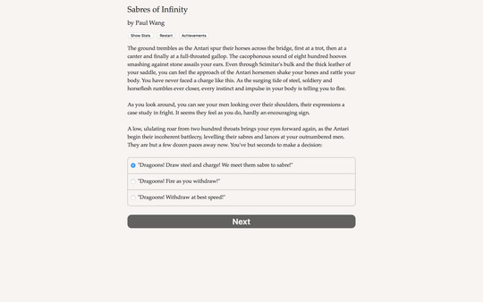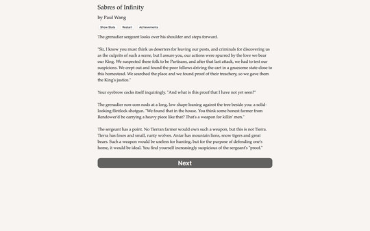 "Sabres of Infinity" — это интерактивная приключенческая игра в жанре визуальной новеллы, сочетающая элементы стратегии и тактики в фэнтезийном сеттинге, наполненном политическими интригами и военными конфликтами. Каждый выбор, который вы делаете, имеет свои последствия, и это действительно заставляет задуматься о том, как принимает решение ваш персонаж.