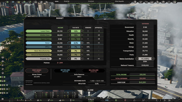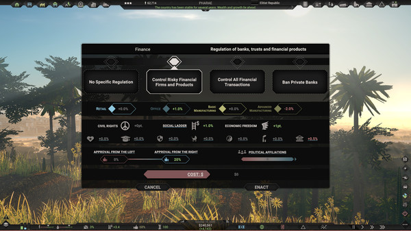 Процесс создания и управления своим государством получается захватывающим и порой непредсказуемым. Все начинается с выбора начальных условий, и уже с этого момента начинается настоящая игра — выстраивание отношений, расправление с коррупцией и борьба за влияние. Все элементы, от налоговой политики до социальной стабильности, ощущаются так, будто каждое ваше решение может кардинально изменить ход событий.