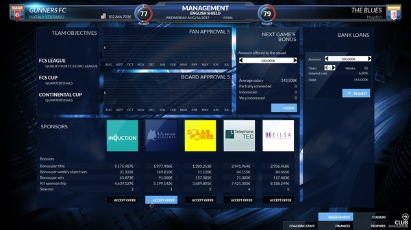 Интерфейс интуитивно понятен, и это дает возможность сосредоточиться на стратегии, а не тратить время на изучение механик. Каждое принятое вами решение, будь то покупка нового игрока или тактические изменения на поле, ощущается очень весомо. Напряжение нарастает, когда ваш клуб попадает в критическую ситуацию — от вас зависит, как справиться с давлением и вывести команду из кризиса.